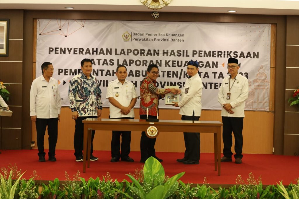 Penyerahan Laporan Hasil Pemeriksaan (LHP) atas Laporan Keuangan Pemerintah Daerah (LKPD) Tahun 2023 Kota Tangerang, dari Kepala Perwakilan BPK RI Perwakilan Banten Dede Sukarjo kepada Ketua DPRD Kota Tangerang Gatot Wibowo dan Pj Walikota Tangerang Dr. Nurdin. Bertempat di Kantor BPK RI Perwakilan Provinsi Banten. Rabu (08/05/2024) lalu.